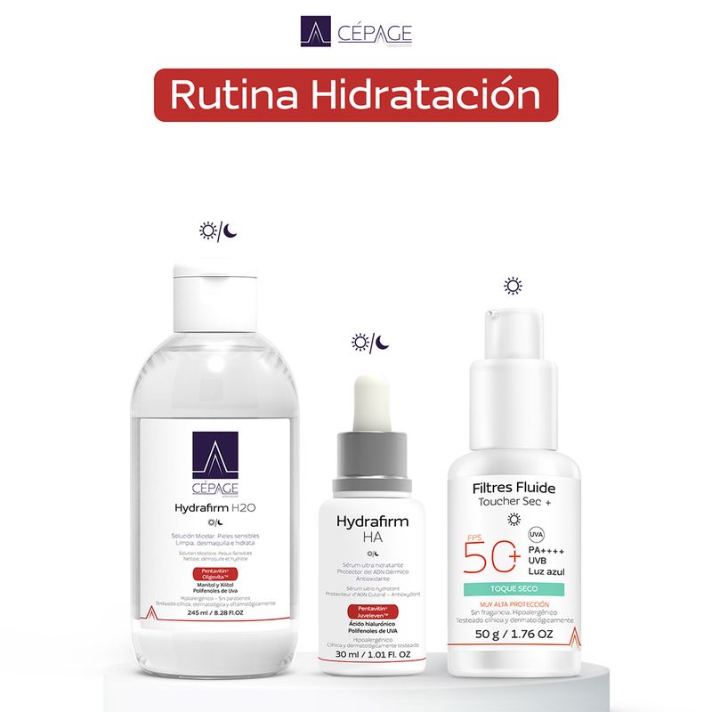 Incluye Hydrafirm H2O, Hydrafirm HA Sérum y Filtres Fluide Toucher Sec +.