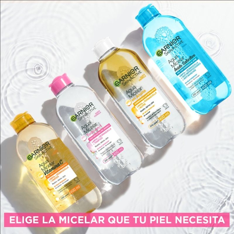 Combiná de acuerdo a tus necesidades con el Agua Micelar Bifásica de Garnier para remover maquillaje a prueba de agua, y el Agua Micelar Pure Active para matificar la zona T en pieles grasas.