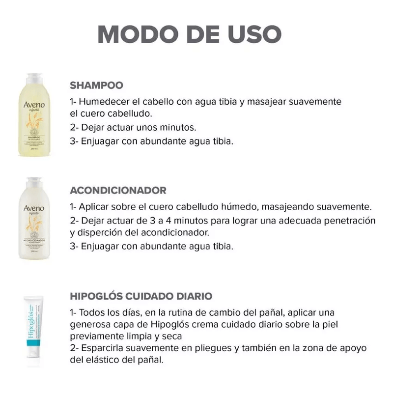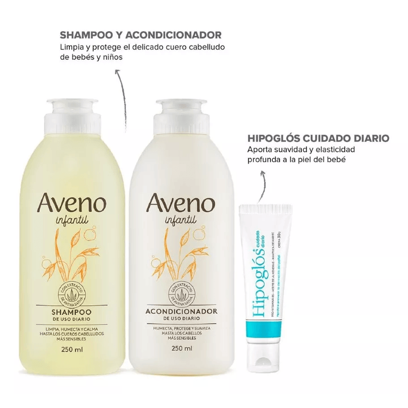 Recomendados a partir de los seis meses, el Shampoo y Acondicionador Aveno Infantil que nutre e hidrata, fortaleciendo la membrana celular y cuidando la estructura de la piel, además de reducir la seborrea del lactante. No tiene conservantes y no irrita los ojos.