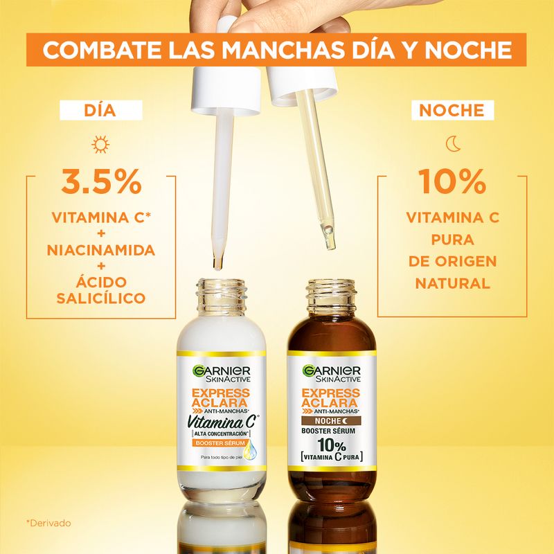 "Probá el nuevo Serum de Vitamina C*, Niacinamida y Ácido Salicílico de Garnier que ilumina la piel y unifica el tono en tres dias**. Apto para todo tipo de piel y testeado con dermatólogos. Resultados visibles: piel con menos manchas, hidratada y radiante. Textura ligera, sin sensación grasosa. Aprobado por Cruelty Free International; pack creado con un 20% de vidrio reciclado. Sin parabenos ni aceites minerales.