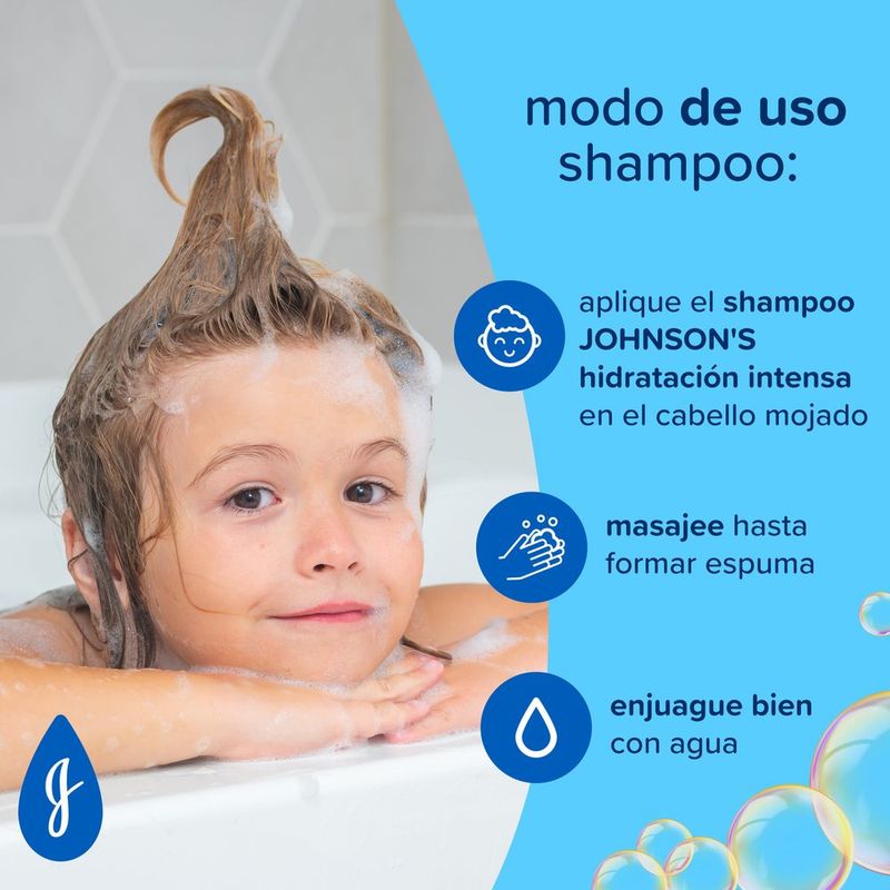 Usar el Shampoo JOHNSON'S® baby Hidratación Intensa, aplicá luego el acondicionador para bebé JOHNSON'S® baby Hidratación Intensa sobre el cabello mojado masajeándolo suavemente hasta obtener espuma abundante. Dejalo actuar por algunos instantes y enjuagá bien.