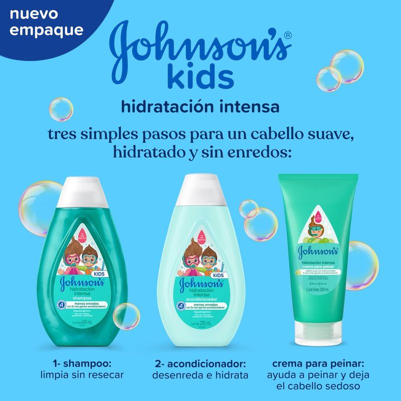 Para un acondicionamiento completo, se recomienda también la crema para peinar JOHNSON'S® baby Hidratación Intensa. El uso de toda la línea JOHNSON'S® baby Hidratación Intensa deja el cabello brillante, con cuerpo y fácil de peinar.