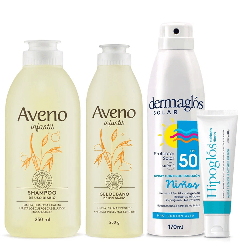 Combo para el cuidado y protección de los pequeños. Hipoglós pomada protege de paspaduras y los productos Aveno ofrecen limpieza suave, hidratación y protección para su delicada piel y cabello. Completa su protección con Dermaglós solar spray fps50.