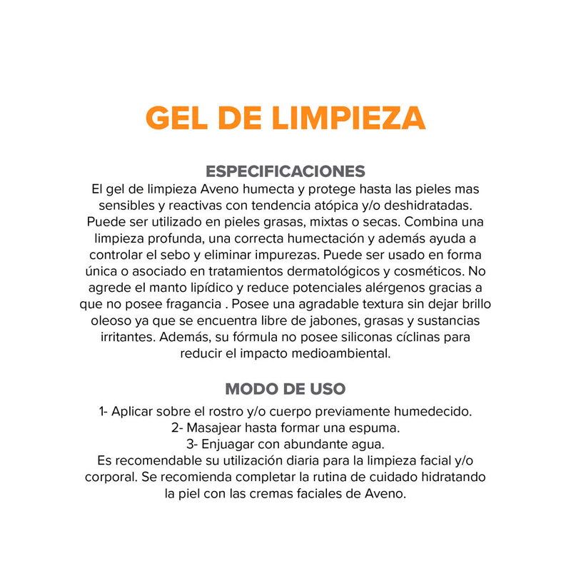 Gel de Limpieza. Con extracto de avena sativa. Libre de gluten. Hipoalergénico. Sin parabenos. No testeado en animales. Testeado dermatológicamente.