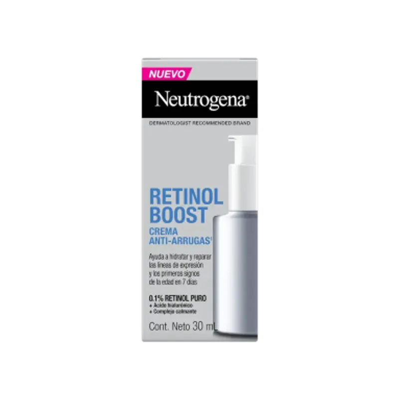 Crema Retinol Boost Anti-Arrugas NEUTROGENA® 30ml: Crema anti-arrugas, que complementa el proceso de renovación natural de la piel para iluminarla y suavizar la apariencia de líneas finas. Ayuda a hidratar y reparar las líneas de expresión y los primeros signos de la edad en 7 días. Formulado con 0.1% de retinol puro, un tipo poderoso de vitamina A recomendada por dermatólogos, que ayuda a mejorar la apariencia de las líneas de expresión, la piel opaca, las arrugas y el tono desigual de la piel. Científicamente demostrado que es superior a los ésteres de retinol comúnmente utilizados. A su vez, cuenta con ácido hialurónico que contribuye en la hidratación y rejuvenecimiento del aspecto de la piel y un complejo calmante que nutre la piel y ayuda a minimizar las causas potenciales de incomodidad para una buena experiencia de uso.