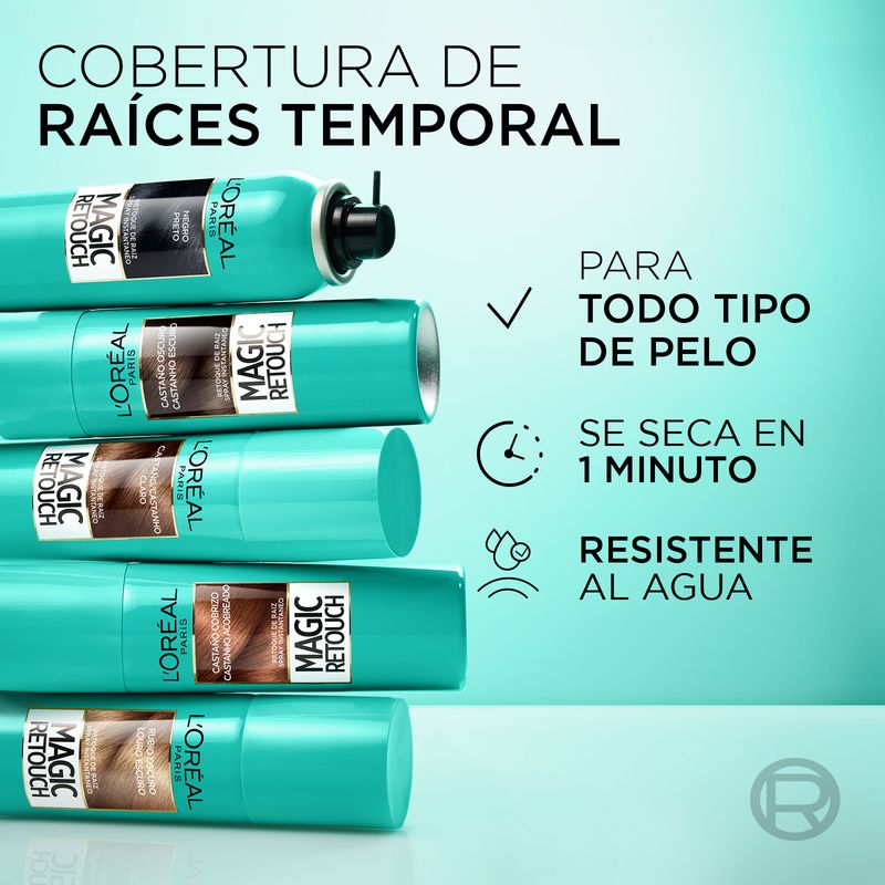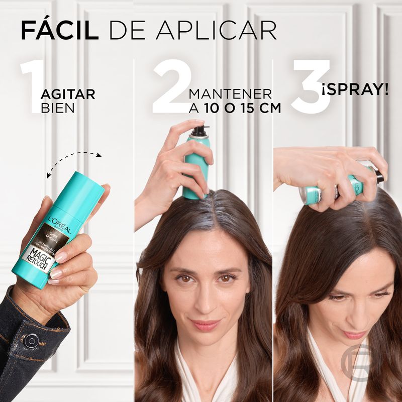 Cubre raíces y canas para un efecto recién teñido al instante. 9 de cada 10 compradoras lo recomiendan. Es rápido, fácil y universal. Es rápido porque cubre raíces y canas al instante. Además es fácil gracias a su micro-difusor ultra preciso. Por último es universal porque se adapta a cualquier color, de rubio claro a negro. Aplícalo sobre tus raíces, contorno de la cara y/o sienes y decile adiós al efecto raíz en sólo 3 segundos.