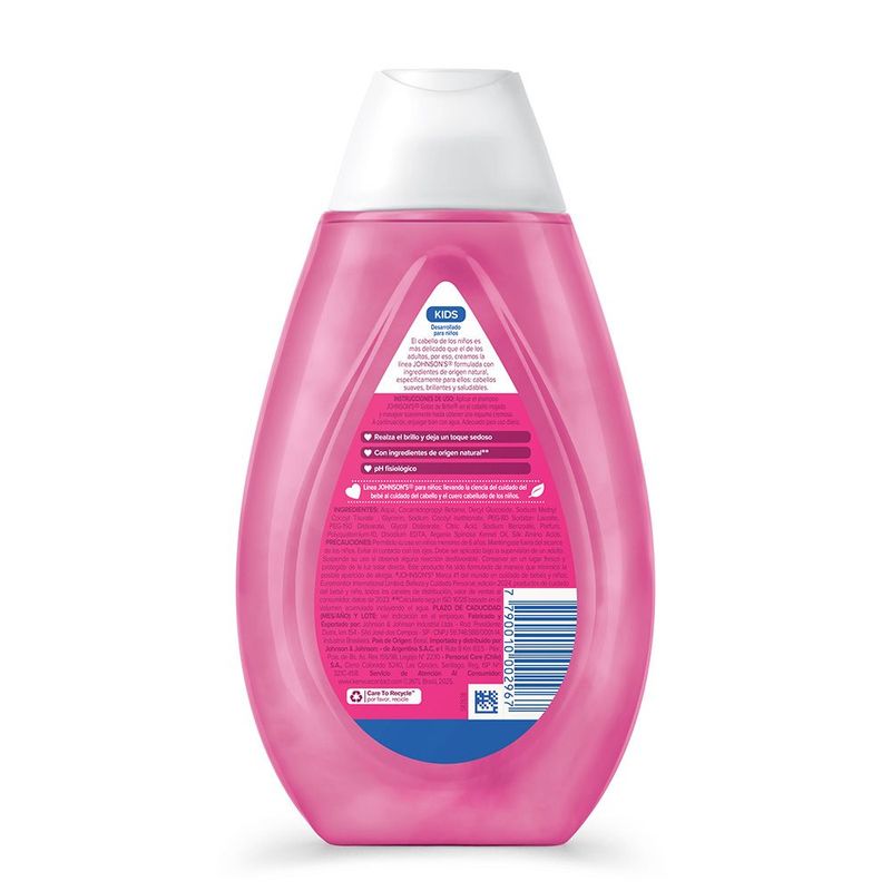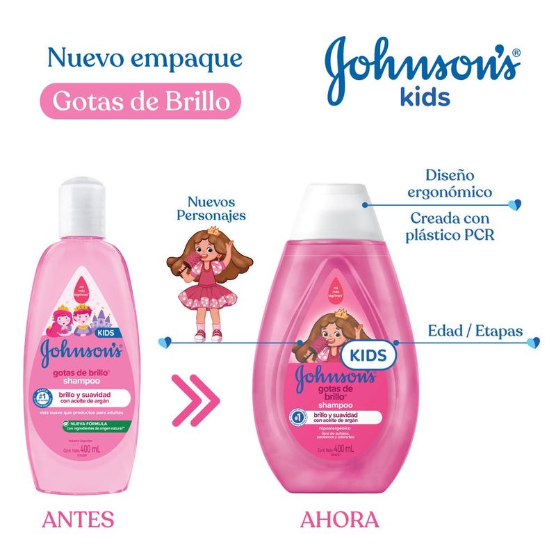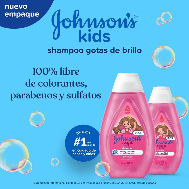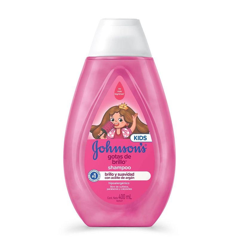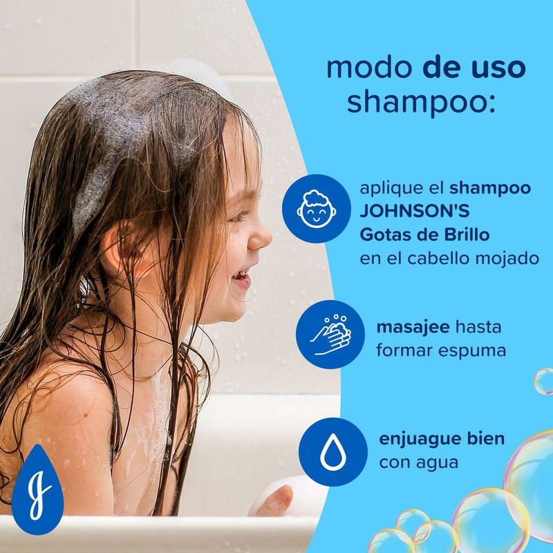 El Shampoo JOHNSON'S® Gotas de Brillo realza el brillo natural del cabello,dejándolo suave y con un toque aterciopelado,ya que cuenta con aceite de argán y proteínas de seda en su formulación. Posee pH fisiológico, es hipoalergénico y libre de colorantes, parabenos, sulfatos y ftalatos. Para cabellos aún más brillantes, suaves y sedosos, complementa con los productos restantes de la línea: acondicionador y spray para peinar. Debe ser aplicado por un adulto o bajo la supervisión de uno. No utilizar en caso de que el cuero cabelludo presente irritaciones. Adecuado para su uso diario.