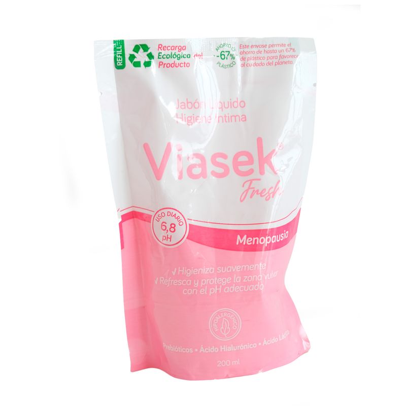 Viasek Fresh Higiene Íntima durante la Menopausia es un jabón líquido especialmente diseñado para acompañar los cambios propios de esta etapa de la vida de la mujer.